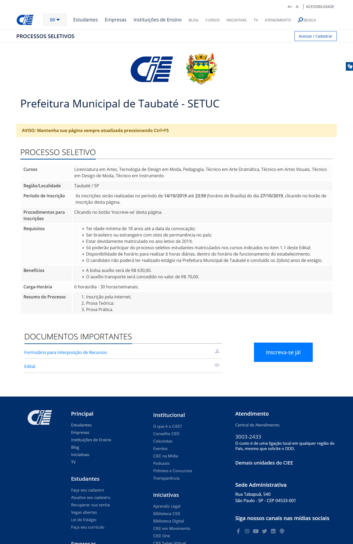 Fui destacado da equipe de designers para participar da mudança de página do CIEE. Um dos projetos de que cuidei sozinho foi a nova versão da página de Processos Seletivos Especiais do CIEE. A versão anterior não era responsiva e estava baseada em tabelas. Por outro lado, as novas páginas foram construídas com Bootstrap e são totalmente responsivas, funcionando perfeitamente em dispositivos móveis.